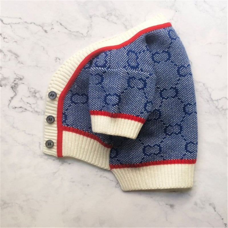 Blue monogram knit dog cardigan with contrast trim and gold-tone buttons. Soft, stylish, and heritage-inspired.