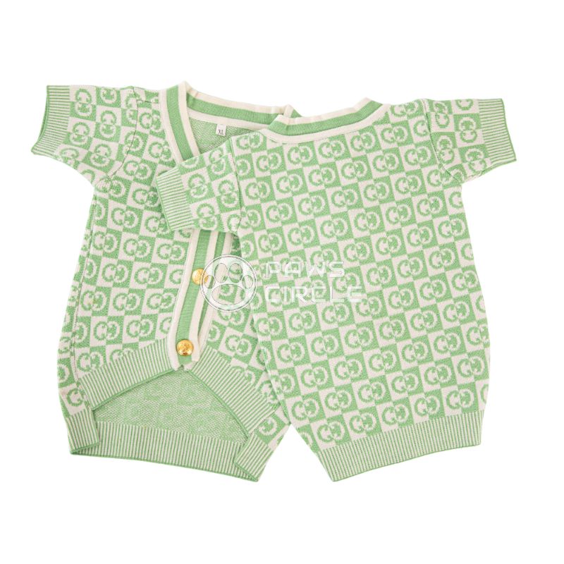 A stylish checkered monogram dog cardigan with gold button closure and soft knit fabric designed for warmth, comfort, and fashionable everyday wear.