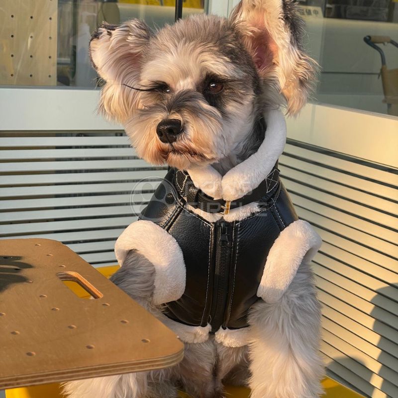 A stylish sleeveless aviation-inspired dog jacket designed for small dogs who love to look cool while staying warm. This jacket features a sleek faux leather exterior that gives it a classic aviator look with a modern, polished finish.